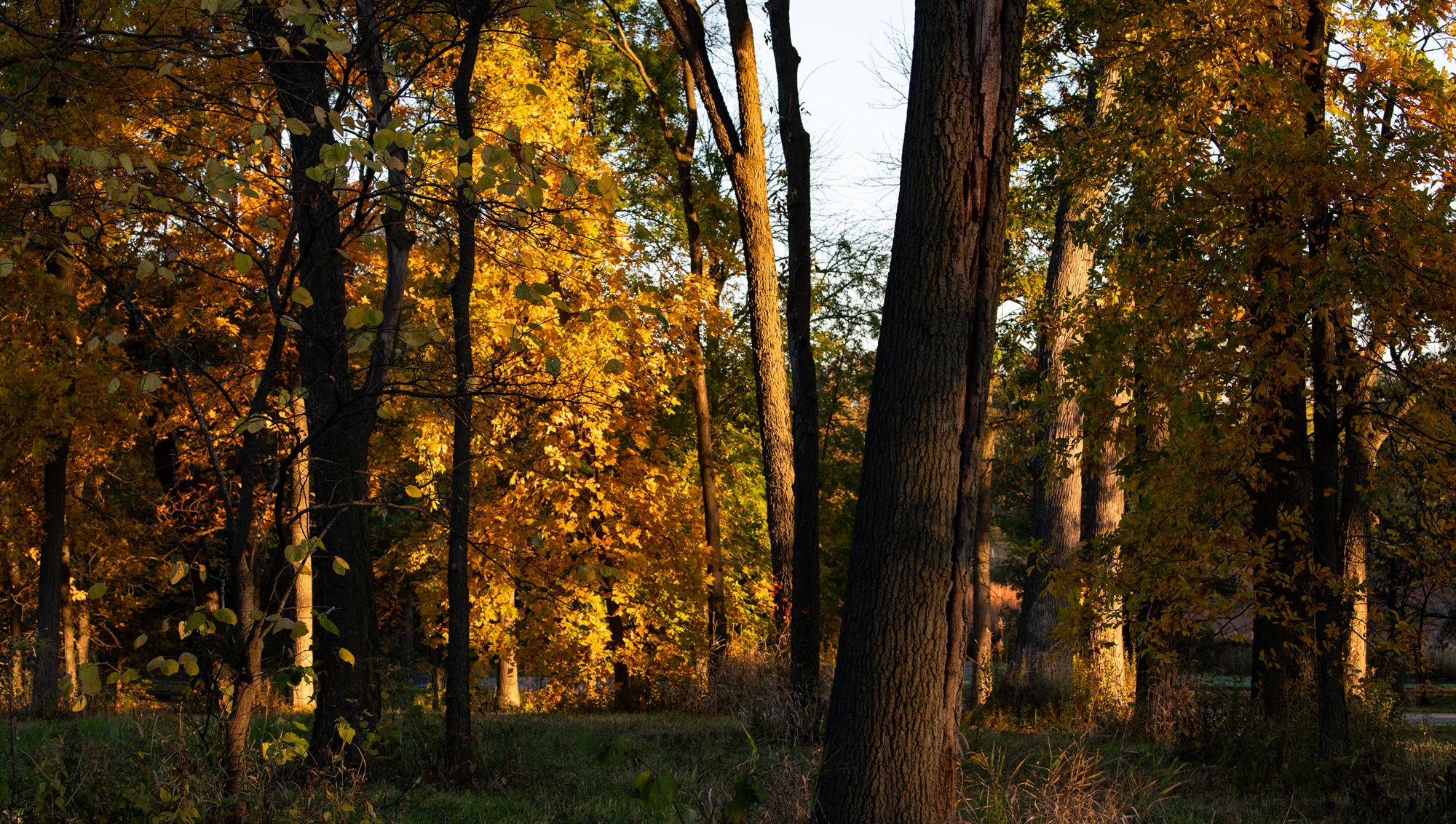- The East Woods, where sugar maples are yellow with highlights of red and orange, easy to enjoy from the road and along trails between parking lots P-8 and P-15
